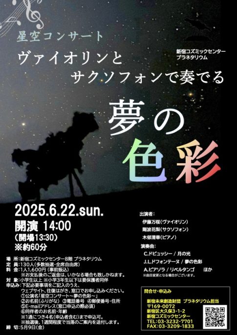 NEWS☆星空コンサート☆ 〜ヴァイオリンとサクソフォンで奏でる夢の色彩〜 ↑クリックするとチラシをご覧いただけます。 プラネタリウムで瞬く無数の星々の中で、ヴァイオリン、サクソフォン、ピアノが織り成す儚くも美しいハーモニーに心...